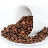 На картинке изображена чашка, наполненная кофейными зернами. Бобы темно-коричневого цвета и кажутся цельными, без видимого обжарки или измельчения. Они помещаются внутри чашки, которая установлена на обеденный стол.
