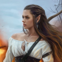 long hair styled in waves, and her expression is serious as she gazes off into the distance. The background suggests a dramatic or possibly historical setting with smoke or fire in the background, which could imply that there is some