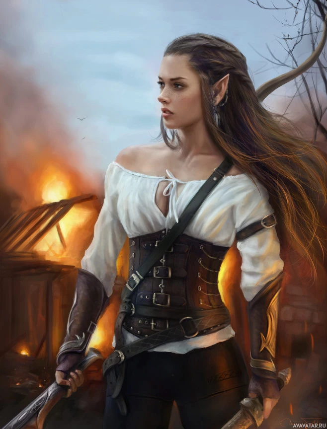 a fantasy elf. She is wearing period-style clothing with lace and leather details, including a corset and sleeveless garment, accessorized with