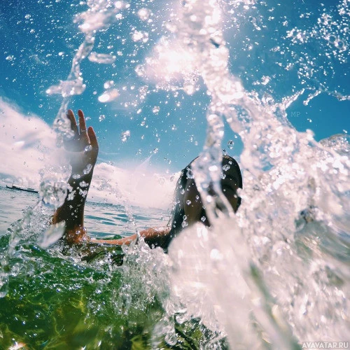 The image features a person, likely a girl or woman, in the water. She appears to be enjoying herself as she is splashing with water around her head and shoulders, which suggests she might be swimming or playing in the waves. The clear