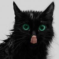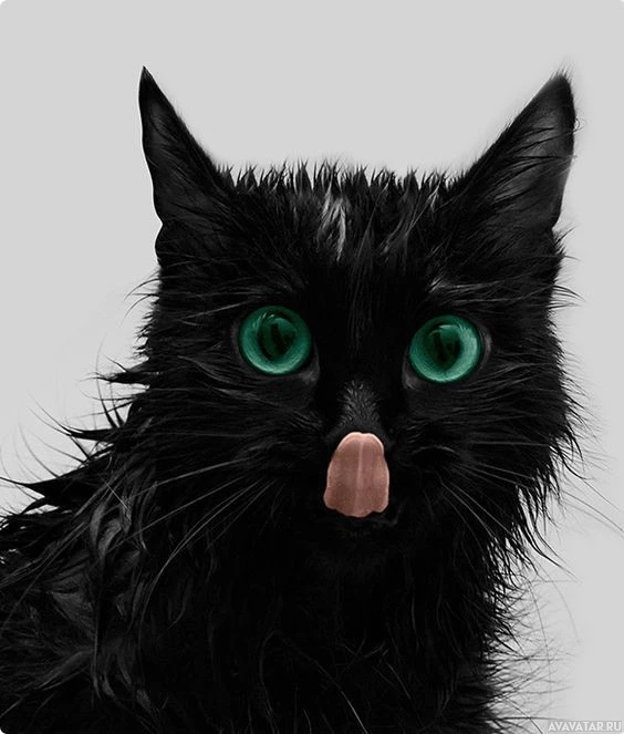 На снимке изображена черная кошка с зелеными глазами. Он кажется влажным, возможно, будучи в воде или только что вымытым, о чем свидетельствует взъерошенный мех и блестящая поверхность его шерсти. Кошка смотрит прямо в камеру с выражением, которое может указывать на любопытство или бдительность.