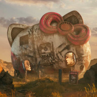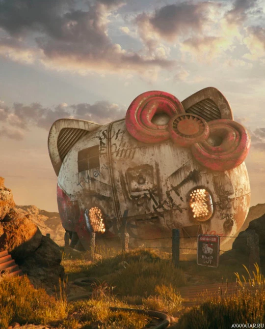 a cat face on the front, which is reminiscent of a tanker truck. The setting seems to be an abandoned or post-apocalyptic environment, possibly a desert landscape with