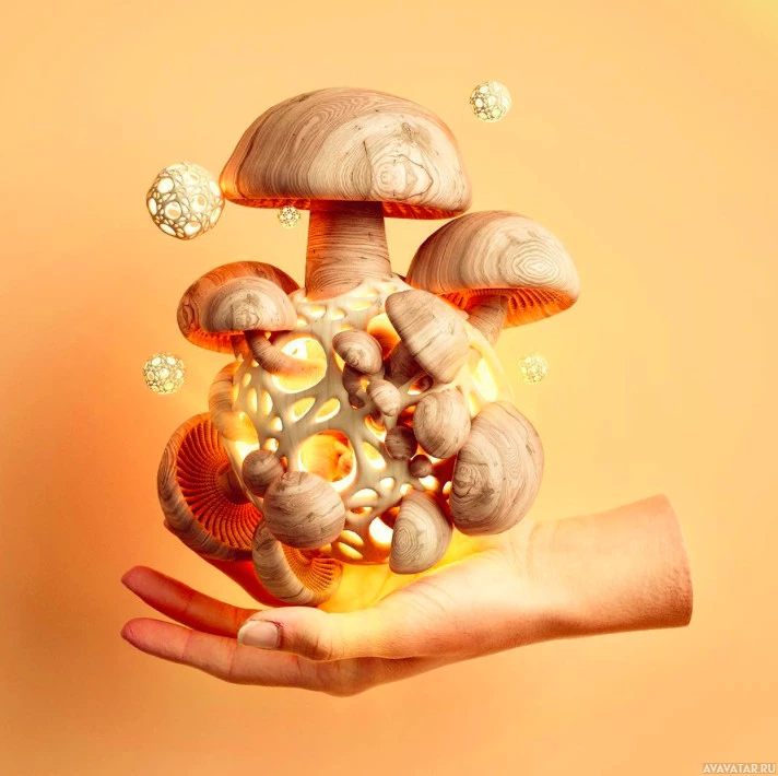 various mushrooms growing out from its surface, resembling the umbilical cord of an embryo inside the egg. There are also