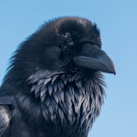 На снимке изображена ворона, повернувшая голову в сторону. Кажется, что она смотрит прямо в камеру или на кого-то, кто делает снимок, придавая своему лицу сосредоточенное и несколько любопытное выражение.