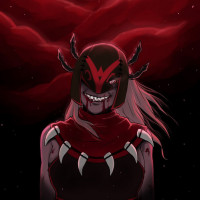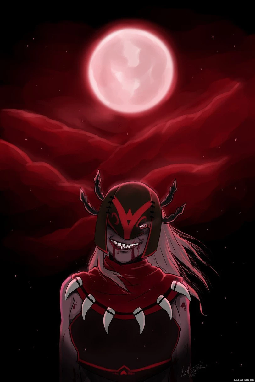 the video game "Dota 2," specifically depicting Bloodseeker. The character is shown with a mask that has large fangs and