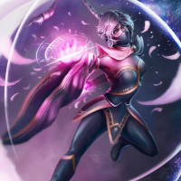 close combat while also utilizing spells or abilities at range. The background is a stylized version of a galaxy, with stars and nebulae, which adds to the fantasy elements of the character's design.