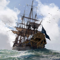 sailing ship with a flag at the front, floating on choppy waters. There are clouds in the sky, suggesting an overcast day or