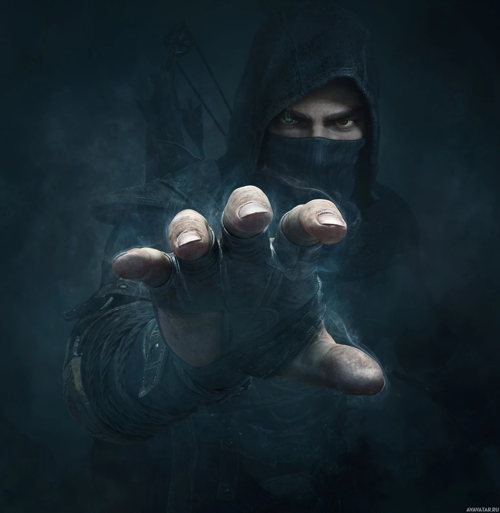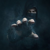 dark clothing, wearing a mask that obscures their face, and has one hand extended as if reaching for something or preparing to make an attack. The background has a moody, atmospheric quality with