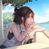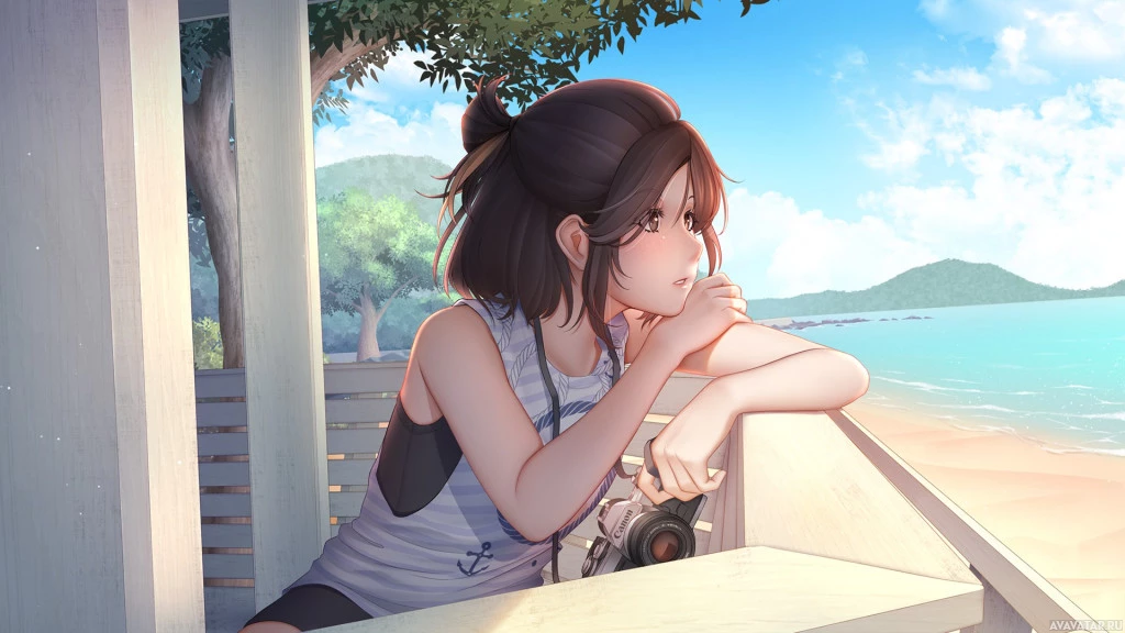 an animated character, a young girl with short brown hair and a white headband, sitting on a bench by the ocean. She is leaning against her elbows and looking out towards the water, appearing relaxed or perhaps pondering something. Behind her, there are
