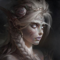 pointed ears and is adorned with various accessories such as jewelry, including what appears to be earrings, and a headpiece or crown-like object on her head. She has