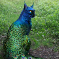 a domestic cat with the vibrant and ornate feathers characteristic of a peacock, resulting in an imaginative and whimsical creature that doesn't exist in nature.