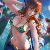 red hair. She is dressed in a swimsuit and holding a paddle, suggesting she might be preparing to engage in water-