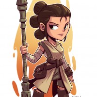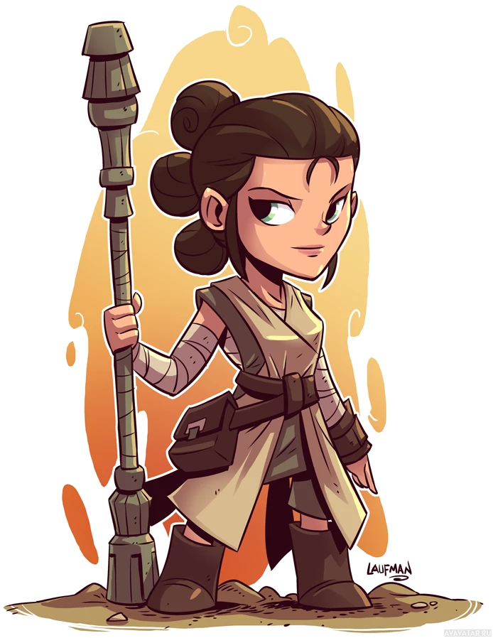 The image shows a stylized illustration of Rey, a character from