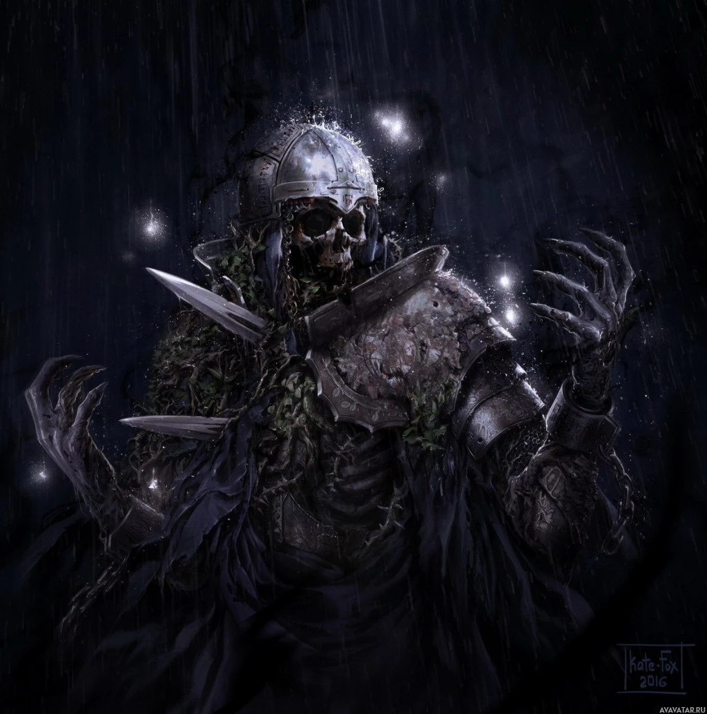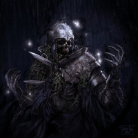 The image features a fantasy-themed character that appears to be a warrior or a knight. However, this is not an ordinary warrior; the character has a twist—he's been transformed into a zombie with elements of decay and possibly even a skull as part of his armor or helmet. The background depicts a stormy,