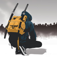 The image depicts a person from behind, wearing a hood and carrying a backpack. On their back, there are two swords crossed. The figure appears to be in