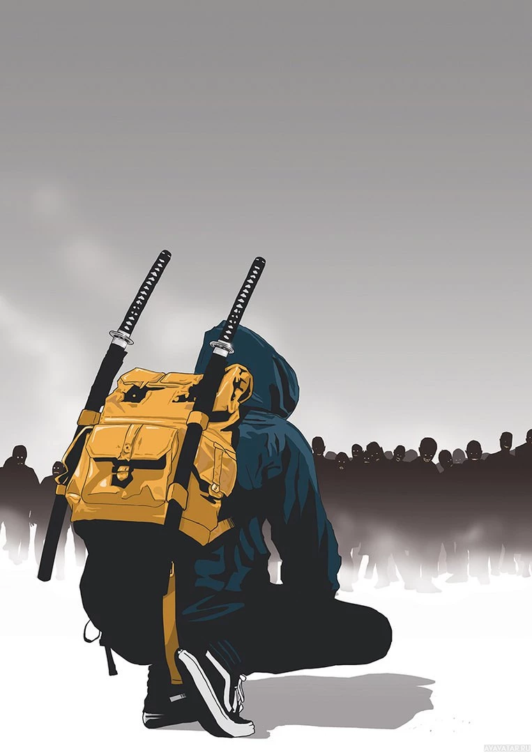 the silhouette of the person with the swords on their back. The image has
