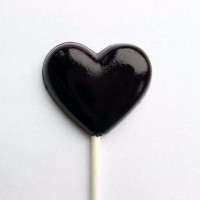 На картинке показан леденец в форме сердца с шоколадным или темным конфетным покрытием. Похоже, что он находится на палочке, вероятно, сделанной из дерева или бумаги, что является распространенным способом отображения этих видов кондитерских изделий для продажи или в качестве украшений.