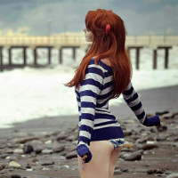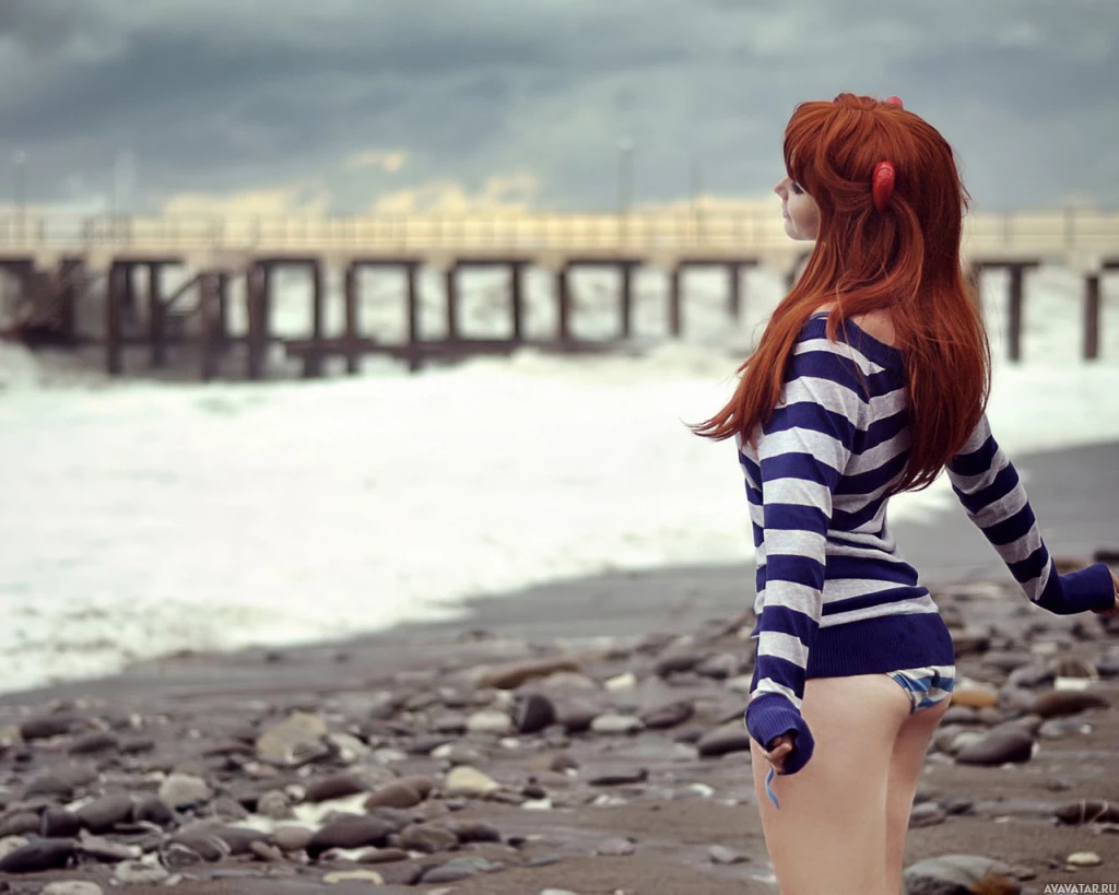 red hair and is wearing a striped jacket with a maritime theme. The background features an overcast sky and the sea, indicating that it might be a coastal scene during a time of calm weather or perhaps on the brink of a storm given