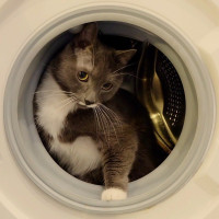This picture shows a grey and white cat sitting inside the drum of a washing machine. The cat appears to be curiously looking out from the laundry basket, which is part of the washing machine's spin cycle mechanism. It seems like the cat has found an interesting hiding place.