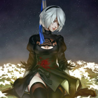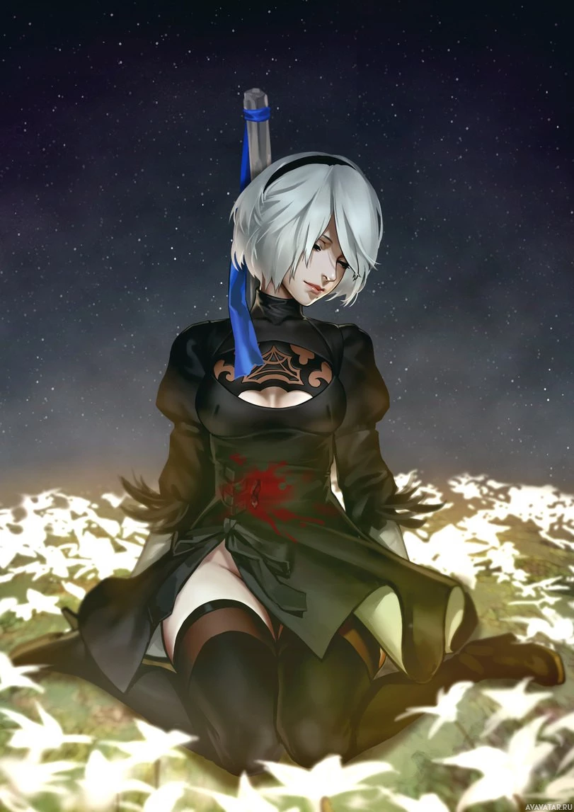 a contemplative pose with her hand on her chest and blood on her shoulder, suggesting she has been injured or has been involved in combat. The setting appears to be at night under