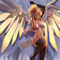The image shows an illustration of Mercy, a character from the video game Overwatch. She is depicted in her angelic form, which includes wings and a halo above her head, reflecting her healing abilities in the game. The logo of Overwatch is visible at the bottom right corner of the image.