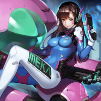 This image features an illustration of D.Va from the video game "Overwatch." She is depicted in her default skins and pose, which are iconic to the character. The art style appears to be influenced by Japanese anime or manga aesthetics, which is consistent with the character's original design in the game.
