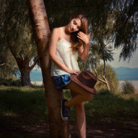 a tree trunk. She is also wearing a hat. The background includes trees and what appears to be the edge of