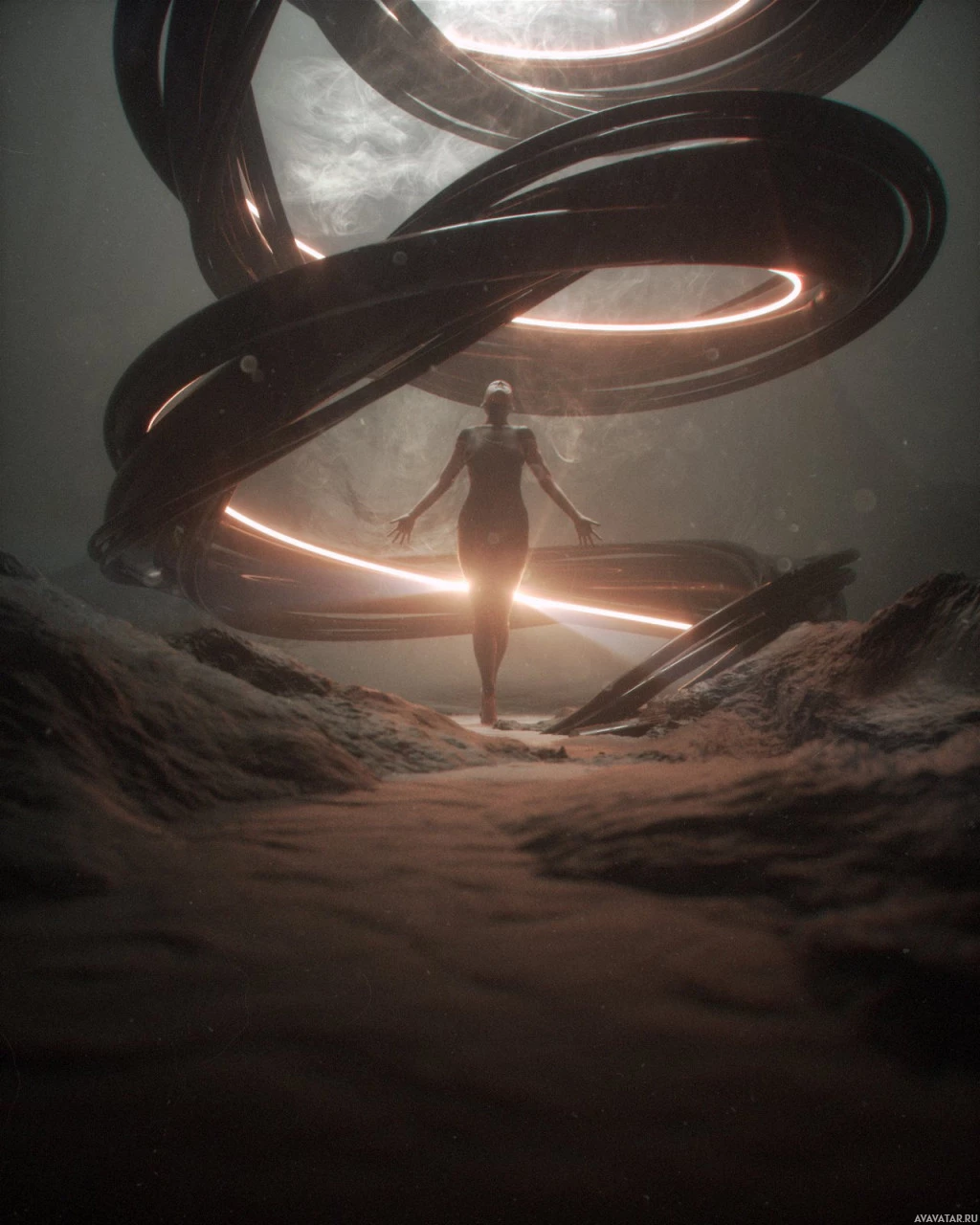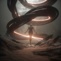 abstract shapes that resemble energy or smoke, giving it an ethereal and mystical atmosphere. There are also elements of what looks like technology or machinery intertwined with