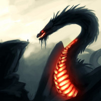 The image features a fantasy scene with a dragon as the central figure. The dragon is depicted with an aggressive posture, standing atop a rocky outcropping. It has sharp teeth and its eyes are glowing red. There's a sense of tension or anticipation in the image, possibly suggesting a scene from a story where the dragon may be guarding a treasure or defending its territory. The background is misty and dark, contributing to an ominous atmosphere.