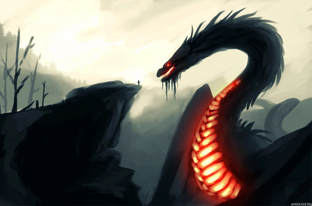 На картинке изображена фантастическая сцена с драконом в качестве центральной фигуры. Дракон изображен с агрессивной осанкой, стоящей на вершине скалистого обнажения. У него острые зубы, а глаза светятся красным. В изображении есть чувство напряжения или ожидания, возможно, предполагая сцену из истории, где дракон может охранять сокровище или защищать свою территорию. Фон туманный и темный, способствующий зловещей атмосфере.