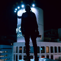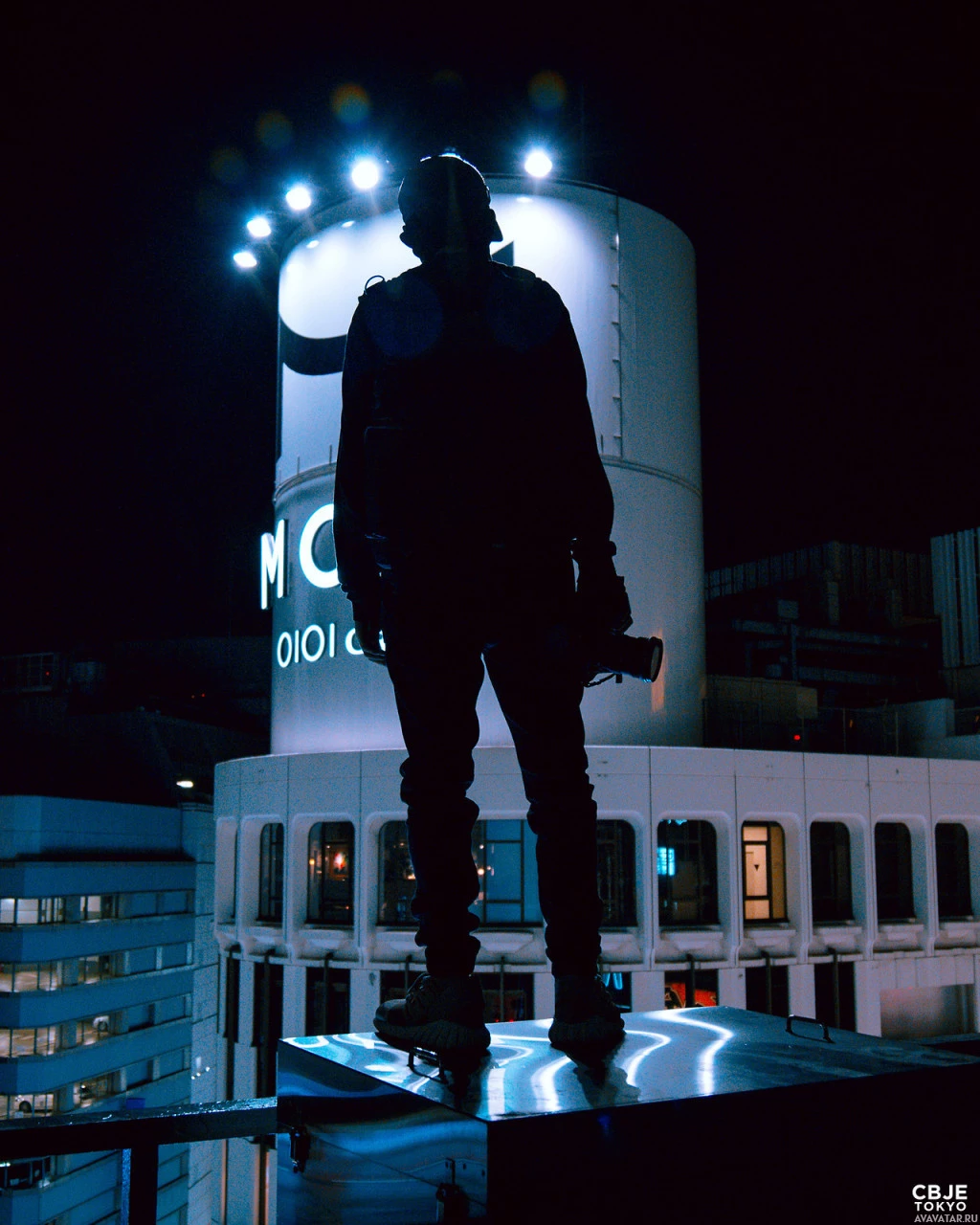 The image shows a person standing on the edge of what appears to be a rooftop. It is nighttime, and the individual is silhouetted against
