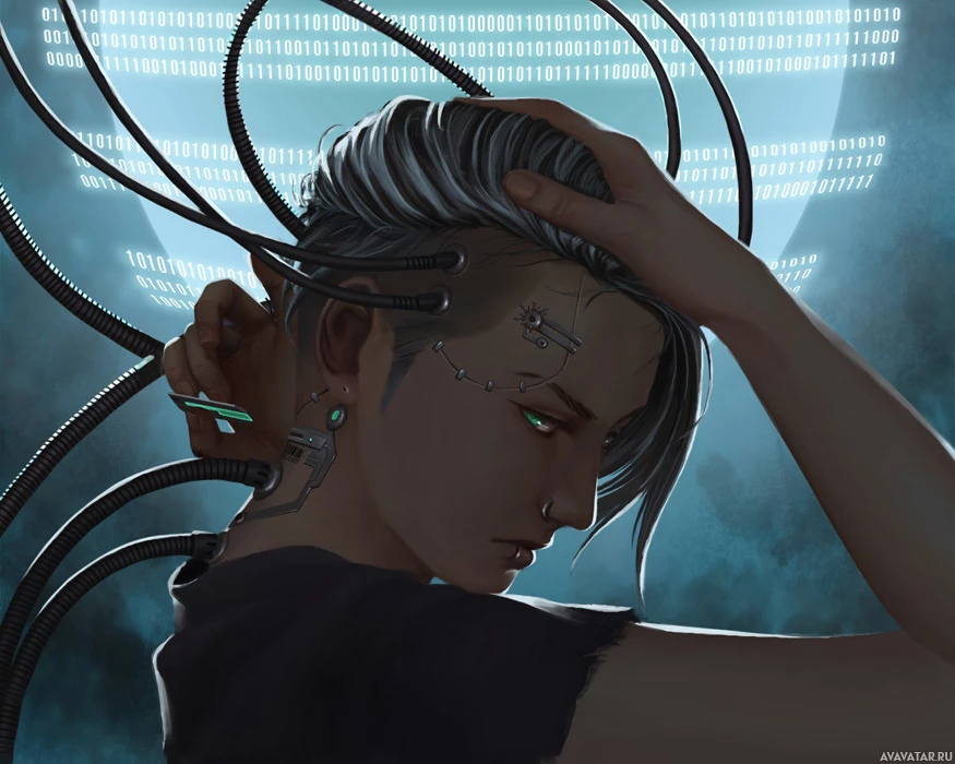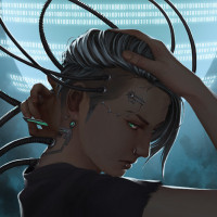 science fiction themed, with digital or circuit-like patterns surrounding the character, suggesting an advanced technology environment.