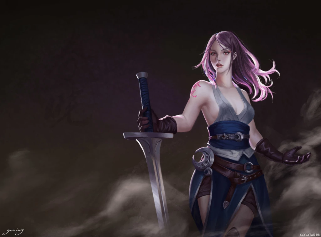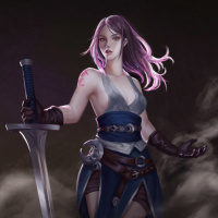 a female character with purple hair, holding a sword in her right hand. She is wearing a medieval or fantasy-style outfit that includes armor and a skirt. Her left hand rests on the sword's hilt. The background is dark and moody, with a smoky or misty atmosphere.