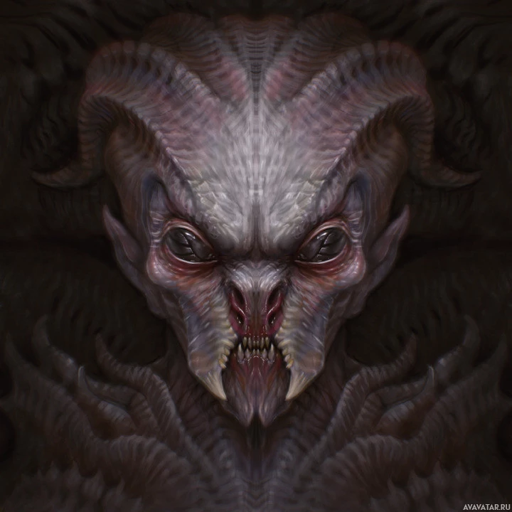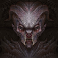 a fantastical creature with the appearance of a demonic or mythical figure. It has multiple features that are often associated with demons or monsters, such as sharp teeth, pointed ears, and glowing