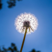 На снимке изображена голова одуванчика (белая пушистая часть растения) с выдувающимися головками семян, возможно, из-за ветра. Небо голубое и ясное, что говорит о том, что это яркий день, который обеспечивает приятный контраст с одуванчиком на фоне.