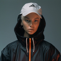 The image shows a person wearing a black Adidas hoodie, a white cap with the brand's logo on it, and