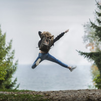 In the image, there is a girl jumping in the air from behind. She is wearing a backpack and appears to be enjoying herself outdoors, possibly at a park or near a body of water due to the open space and the presence of trees. The scene is joyful and energetic, capturing a moment of fun and freedom.