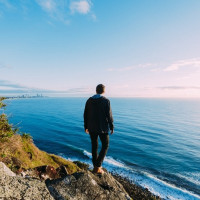 The image depicts a person standing on a rocky shore overlooking the ocean. It appears to be taken from behind, showing the back of the individual as they gaze out at the sea. There is also a city visible in the distance, indicating that this could be a coastal location near a populated area. The sunlight suggests it might be early morning or late afternoon.