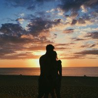 the warm hues in the sky. The silhouettes of the couple are visible against