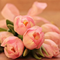a wooden surface, possibly a table or a bench. Tulips are known for their beautiful flowers that come in