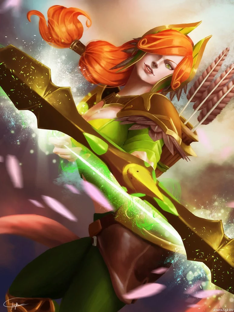 female character known as Windranger from the video game Dota 2. She is holding a bow and arrows, suggesting she may be a ranged