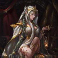 armor pieces, and a headdress that gives her an ethereal and regal appearance. The character is seated on a throne-like structure, which further emphasizes her importance or status. She holds what appears to be a lantern in one hand, possibly representing wisdom or knowledge, and a scepter or staff in the other, symbolizing power or authority. The background suggests an ornate and possibly magical setting, enhancing