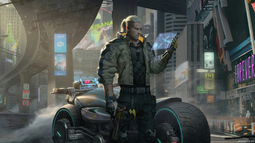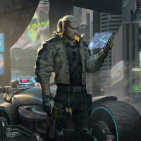 the video game "Cyberpunk 2077." This is a promotional image, possibly for the game or an advertisement. It features a man with a cybernetic arm and a futuristic, dystopian cityscape in the background that includes
