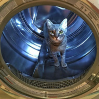 tabby cat standing inside an open washing machine. The cat appears curious or perhaps is seeking warmth, as cats are often attracted to the warmth of a dryer cycle. The setting is indoors, and the cat's expression suggests it might be surprised by being in the appliance.