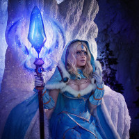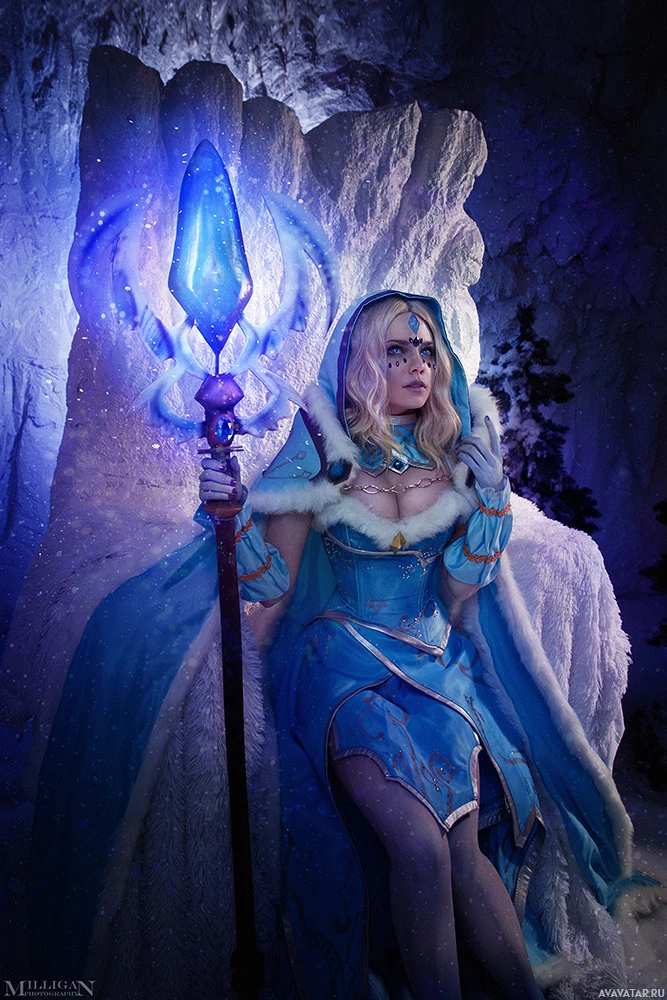 the Crystal Maiden, a character from the game Dota 2. The individual is dressed in