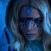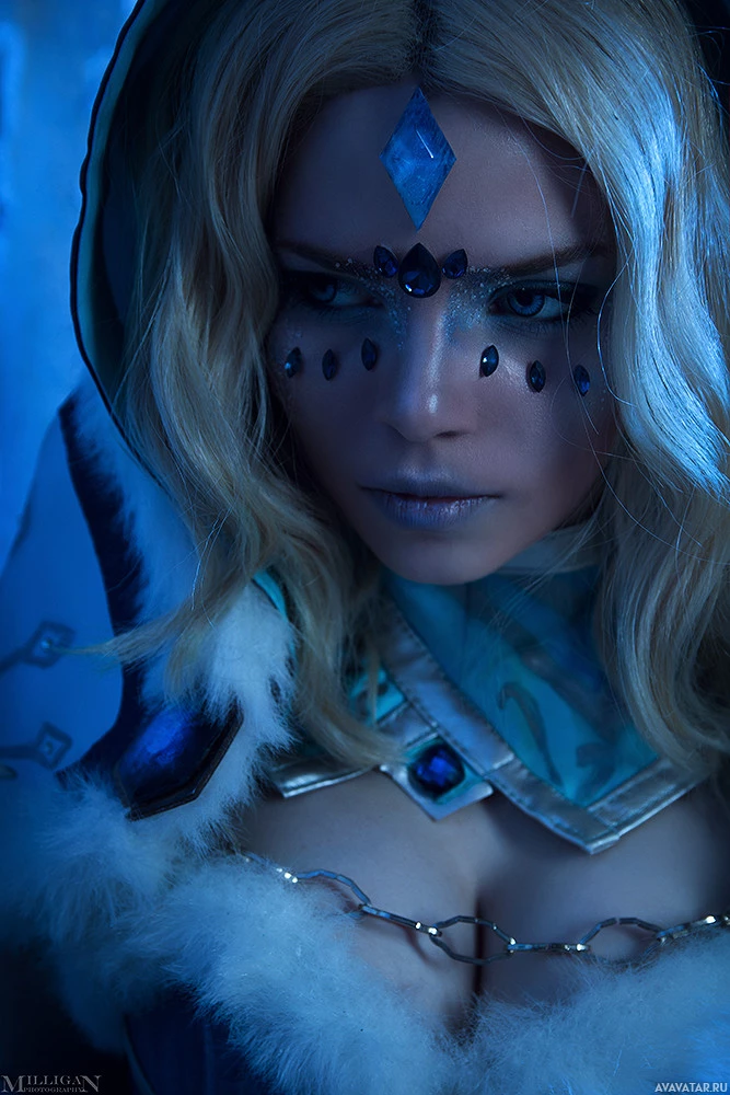 blonde hair, who appears to be cosplaying as Crystal Maiden from the game "Dota 2." She is wearing a fantasy-style costume that includes a blue and white outfit with a design resembling ice or crystals. The attire features elements such as fur trim, armor, and what seems to be a necklace or medallion, adding to the overall mystical theme of her