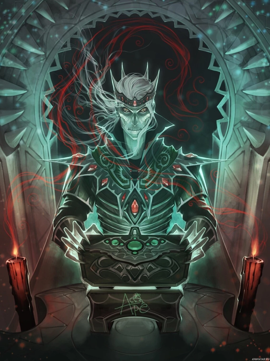 dark energy or magic that is emanating from them. The character is seated on a throne-like chair within what looks like a crypt or