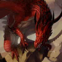 The image depicts a fantasy dragon character. It features a large, red dragon with sharp teeth and horns. The dragon appears to be perched on a rocky outcrop, possibly in a mountainous or forested environment. The art style is realistic with attention to detail that gives the dragon an imposing presence.