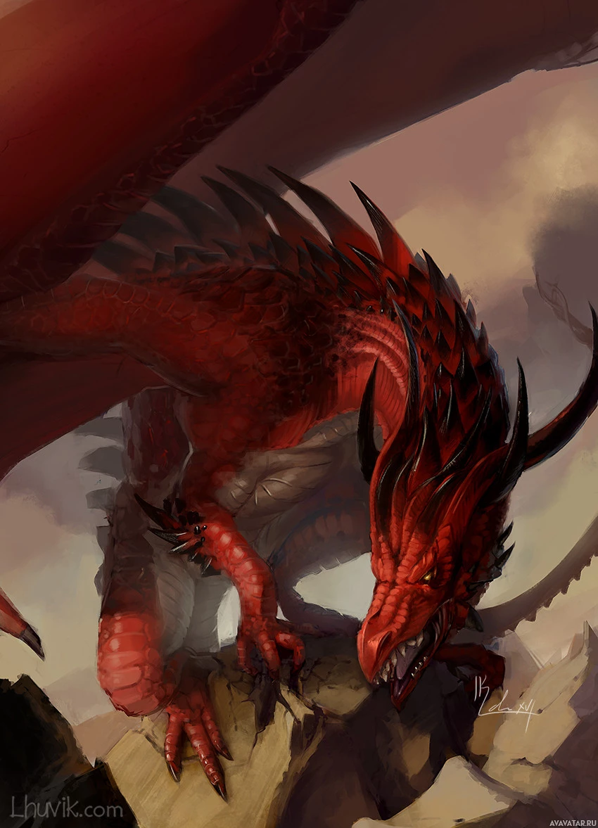 Картинка показывает вымышленного дракона. На ней изображен большой красный дракон с острыми зубами и рогами. Дракон, кажется, находится на скалистом обнажении, возможно, в горной или лесной среде. Художественный стиль реалистичный с вниманием к деталям, что придает дракону внушительное присутствие.