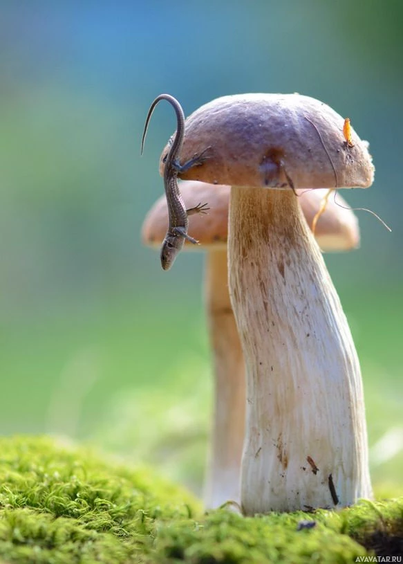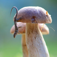 На картине есть небольшая ящерица, расположенная на вершине того, что кажется коричневым грибом с стройным стеблем. Фон предполагает наружную обстановку с естественным светом, освещающим сцену.